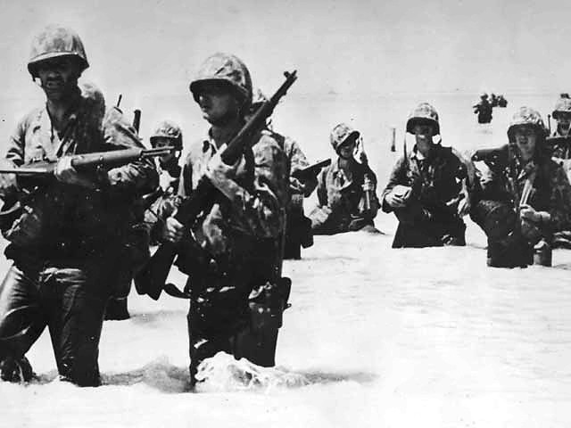 The first three waves, which were to land at three-minute intervals, were in the LVTs. Because of heavier than expected sea conditions, the LVTs were slow, and the first Marines, originally scheduled to land at 0830, didn't touch down until 0913. They were met by intense Japanese fire, and the unarmored LVTs suffered badly. They were unable to cross the seawall, and most of the Marines that did make it ashore were pinned down there. Worse, the planners had not been able to predict the tides accurately, and November 20th had no high tide. This meant that all of the landing craft except the LVTs were stuck on the reef about 500 yards offshore. A few tanks managed to wade ashore, but they were not used very effectively, and most were quickly knocked out.