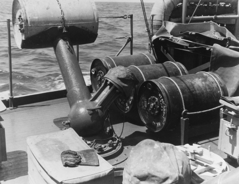 One of the biggest problems, even during WWI, with the traditional depth charge rack was that it only produced a narrow pattern. Submarines could estimate when a ship would lose contact, and then maneuver violently, hoping to dodge the pattern. During WWI, the USN developed the Y-gun, a device mounted on the centerline which threw two depth charges between 50 and 80 yards on either side of the ship. The biggest problem was that it consumed valuable centerline space, which was also in demand for guns and torpedo tubes. To solve this problem, the USN introduced the K-gun, which was essentially half a Y-gun, mounted on the railings. These were mounted in great numbers on destroyers and destroyer escorts during WWII.