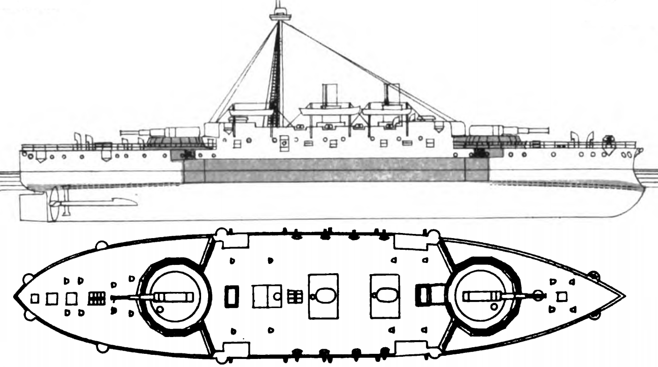 In the mid-1870s, the Italians, followed by the British, adopted a slight modification. Instead of carrying the belt the full length of the hull, they limited it to the length of the citadel, and moved the armored deck slightly below the waterline at the ends. The spaces just above the deck were heavily subdivided and used for storage, making them harder to flood. This scheme protected the buoyancy of the ends, and care was taken to make sure that the ship would remain afloat and stable even if the ends were riddled.4 This armor layout can be thought of as prioritizing protection of stability, as opposed the the protection of mobility provided by the full-length belt. For a given ship, the protective deck is lighter than the full belt, but the ship's speed will suffer if the ends flood. The French never adopted the protective deck and short belt, as they were much more concerned about close-range melees and ramming.