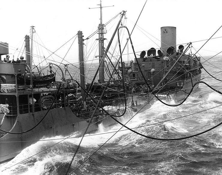 Once everything is hooked up, the two ships and their crews have to maintain their separation while the fuel flows. Modern equipment allows up to 180,000 gallons per hour to be pumped through each hose, although the situation in WWII was somewhat worse.11 At one point during WWII, the oiler Platte steamed next to Enterprise for 5.5 hours at night, separated by only 50'.