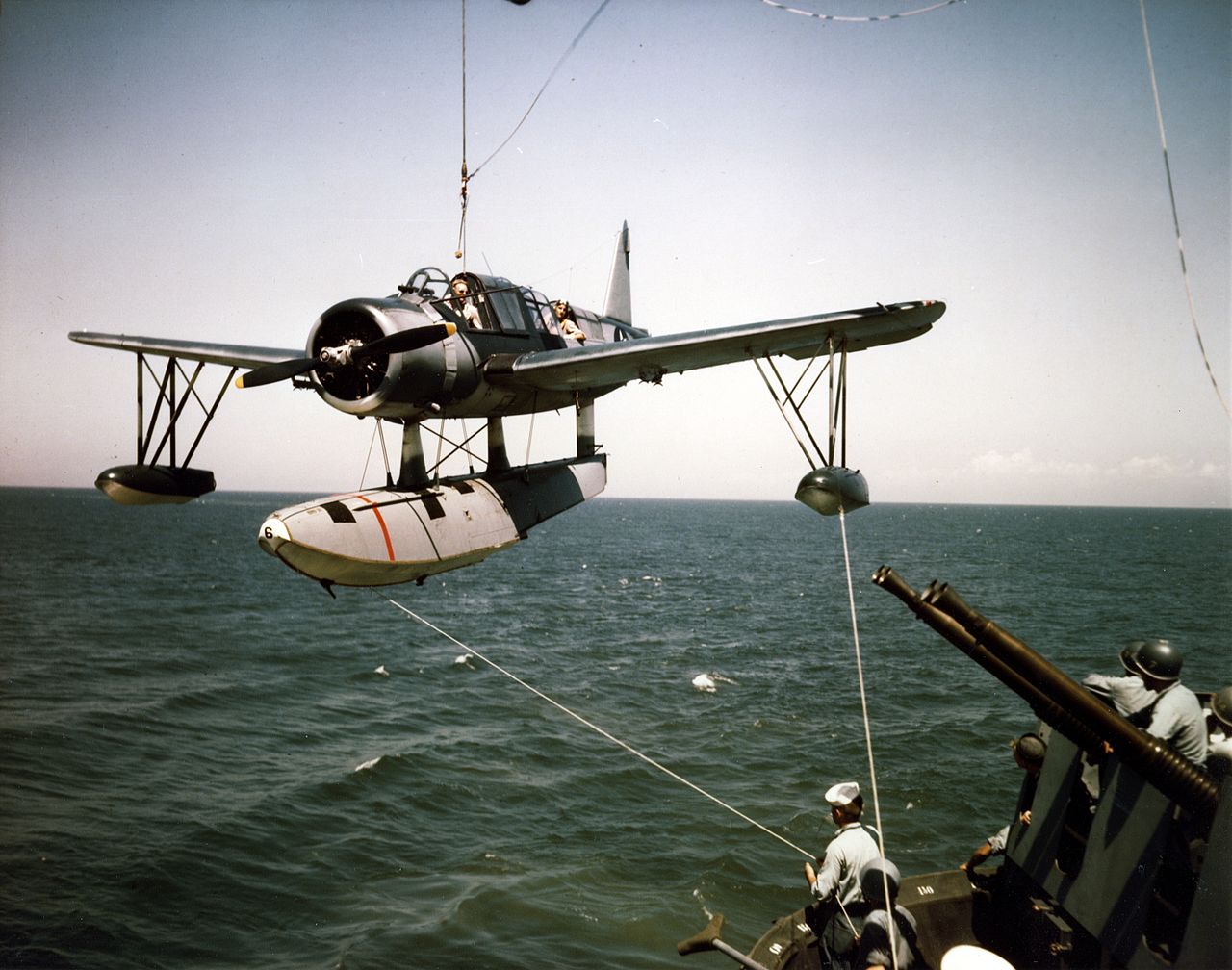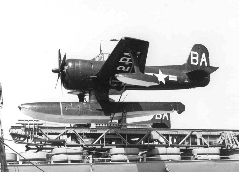 3 Interestingly, I think that the mat made this possible. The traditional recovery method requires at least two men, one to keep the plane on station with the ship while the other goes out and hooks up to the crane. Eliminating the second seat saved a fair bit of weight, which was particularly important in seaplanes, which were constrained by the maximum weight of the catapults. ⇑