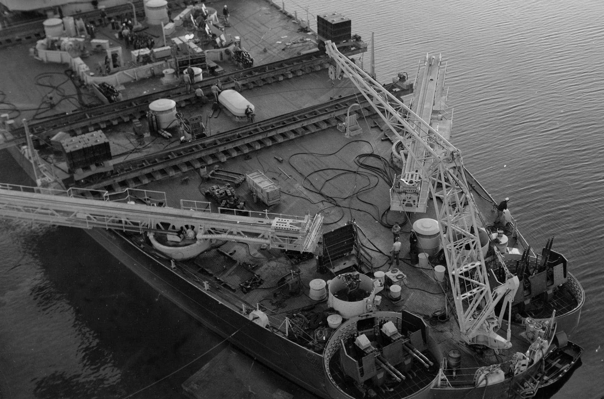 An excellent view of New Jersey's fantail in June 1945, including the crane and catapults. The tracks on deck are for an inclining.
