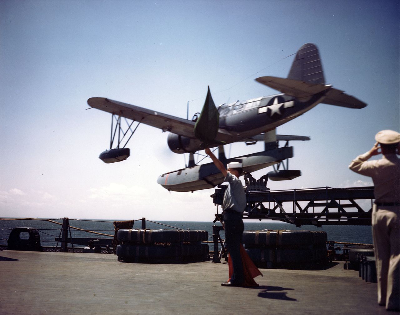 Nor was getting the airplane onto the water the end of the matter. It had to be hoisted back aboard the ship, which was again fairly simple for a stationary ship in calm seas, but rather difficult if it was making any speed, due to the motion of the waves and the occasional tendency of the wake to suck the airplane under the ship. The most obvious way was to taxi the airplane alongside and hold position while a crane was swung out and the line hooked up, then cutting the engine just as the airplane was lifted out of the water. Some navies continued to use this method, including the Germans, but the Americans had devised a better way to solve the problem.