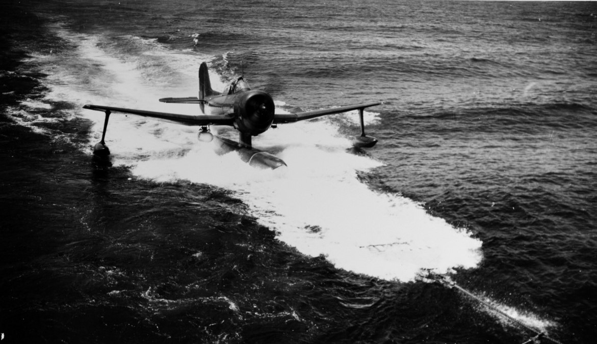 After her refit at Hunter's Point in 1945, Iowa's Kingfishers were replaced with Curtiss SC Seahakws. The Seahawk was by far the highest-performance battleship seaplane ever to enter service, a single-seater3 capable of nearly twice the speed of the Kingfisher. It had two .50 cal Browning machine guns, as well as the same bombload as the OS2U. To make sure the Seahawk could still perform the secondary missions of air-sea rescue and personnel transfer, there was a space inside the fuselage for a passenger. There was also a utility space inside the float that could carry bombs, cargo, or extra fuel, although it tended to leak and was often sealed and used for fuel only.