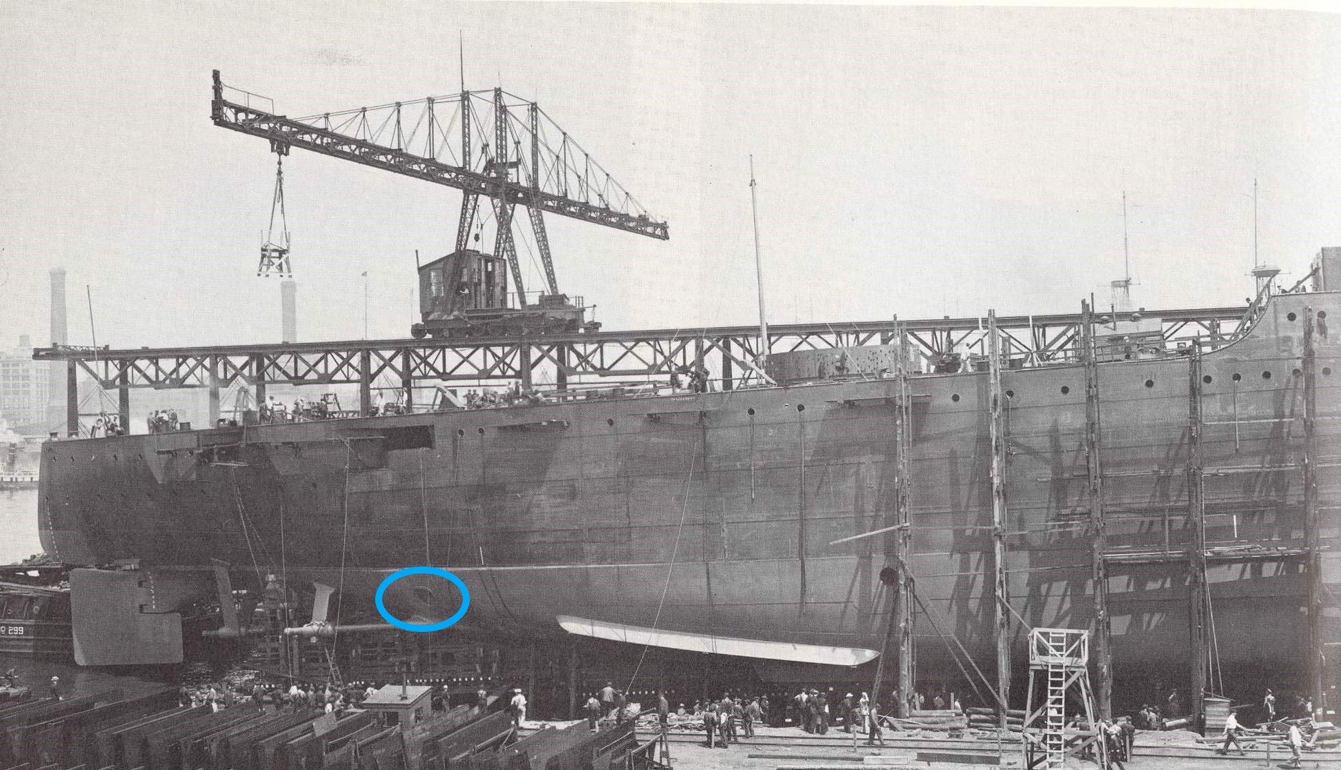 USS Florida in drydock with her torpedo bar extended, circled in blue