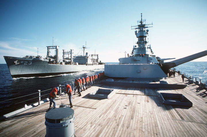 Iowa conducts underway replenishment from the ammunition ship Nitro