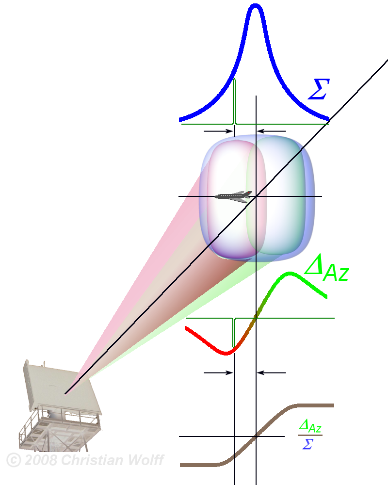 Another important technique is pulse compression, where signal processing is used to increase the radar's resolution and its signal-to-noise ratio.4 Instead of sending pulses at a constant frequency, the radar is "chirped" and transmits a pulse that increases in frequency. Signal processing is then used to compress the pulse by adding delays to lower-frequency returns. Let's say that our radar sends out three discrete pulses, one right after the other, at 101 MHz, 102 MHz and 103 MHz, each lasting .1 microsecond. It then listens for returns on all three bands. When it processes the signal, it delays the 101 MHz signal by .2 microseconds and the 102 MHz signal by .1 microseconds. This will "stack" the returns on all three bands, effectively giving three times the power of the actual transmission, while noise and jamming will be unaffected. This also gives better resolution, as the pulse effectively comes in over .1 microsecond instead of .3.5