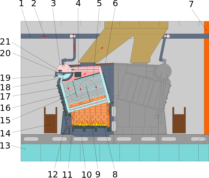 Cross-section of one of Dreadnought's boilers. 1 — main steam pipe; 2 — main steam to engine room; 3 — main steam/water drum; 4 — return tubes; 5 — generating tubes (small); 6 - insulation; 7 — ash hoist; 8 — grate; 9 — fire brics; 10 — ash pen; 11 — generating tubes (large); 12 — furnace door; 13 — reserve feed-water; 14 — coal chute; 15 — cast iron flame plates; 16 — downtake headers; 17 — access door to downtake headers; 18 — water; 19 — upturned pan at the water level connected to scum valve; 20 — wash plate to limit movement of water in drum when ship was rolling; 21 — feed water inlet nozzle.6
