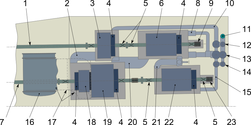 Dreadnought's port engine room. 1 — outlet shaft; 2 — exhaust trunk from high pressure (HP) for low pressure (LP) astern turbine; 3 - HP astern turbine; 4 — dummy piston; 5 — rotor shaft bearings; 6 — HP ahead turbine; 7 — inner shaft; 8 — main steam to HP ahead turbine; 9 — thrust block; 10 — main steam to HP ahead turbine; 11 — main steam from boiler room; 12 — astern manoueuvring valve; 13 — ahead manoueuvring valve; 14 — cruising manoueuvring valve; 15 — main steam to cruising turbine; 16 — main condenser; 17 — exhaust to condenser; 18 — LP astern turbine; 19 — LP ahead turbine; 20 — exhaust trunk from HP for LP ahead turbine; 21 — exhaust trunk from cruising to HP ahead turbine; 22 — cruising turbine.5
