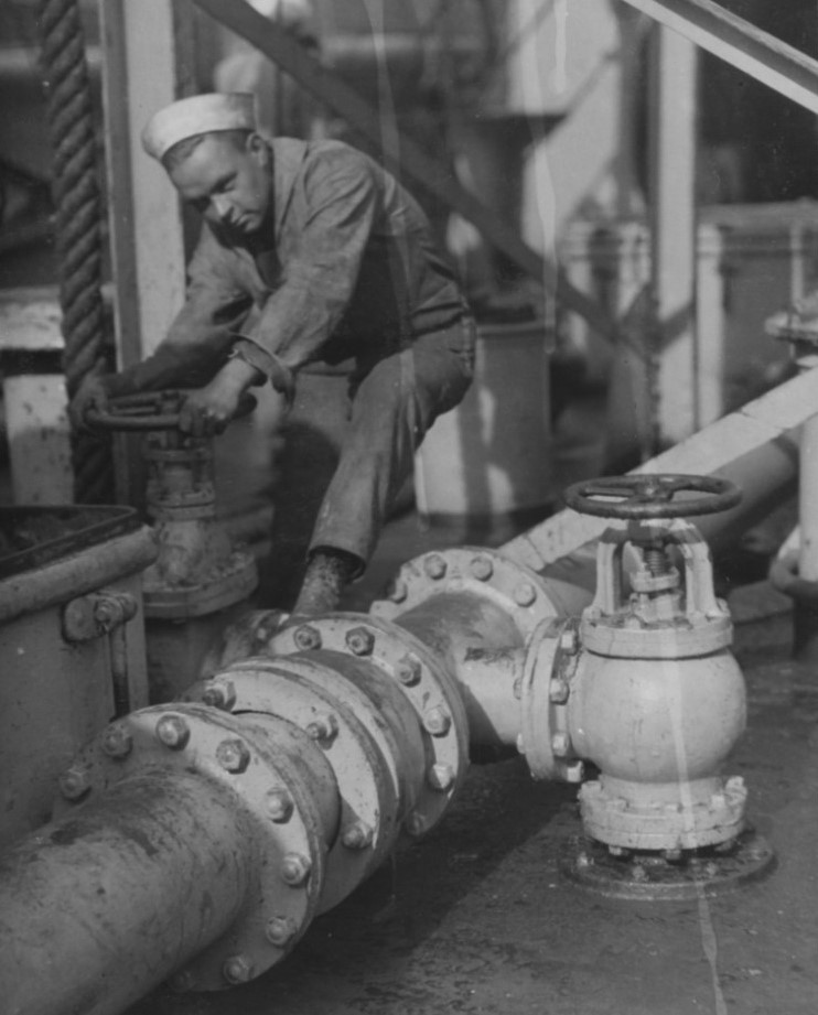 Despite the retrograde nature of her engines, Oklahoma saw another innovation, shared with Nevada. They were the first battleships designed to burn oil alone.8 Oil had many advantages over coal, once efficient oil burners had been invented. Coal, being solid, is difficult to handle. Coaling a ship was a backbreaking exercise that required all hands, and tended to leave a film of coal dust over everything, which is bad for delicate things like optics unless they were covered. Coal also required large crews of stokers, and space around the boiler for coal to be passed into the fires, which in turn limited the size of the boilers. Coal-fired ships could not sustain their maximum speeds very long. Stokers got tired and the nearby bunkers ran out of fuel, forcing the crews to go to less convenient sources of supply. The US estimated that a crew of 100 firemen and 112 coal passers might be replaced by 24 men if oil was adopted. All of this meant that an oil-fired ship could be considerably smaller.
