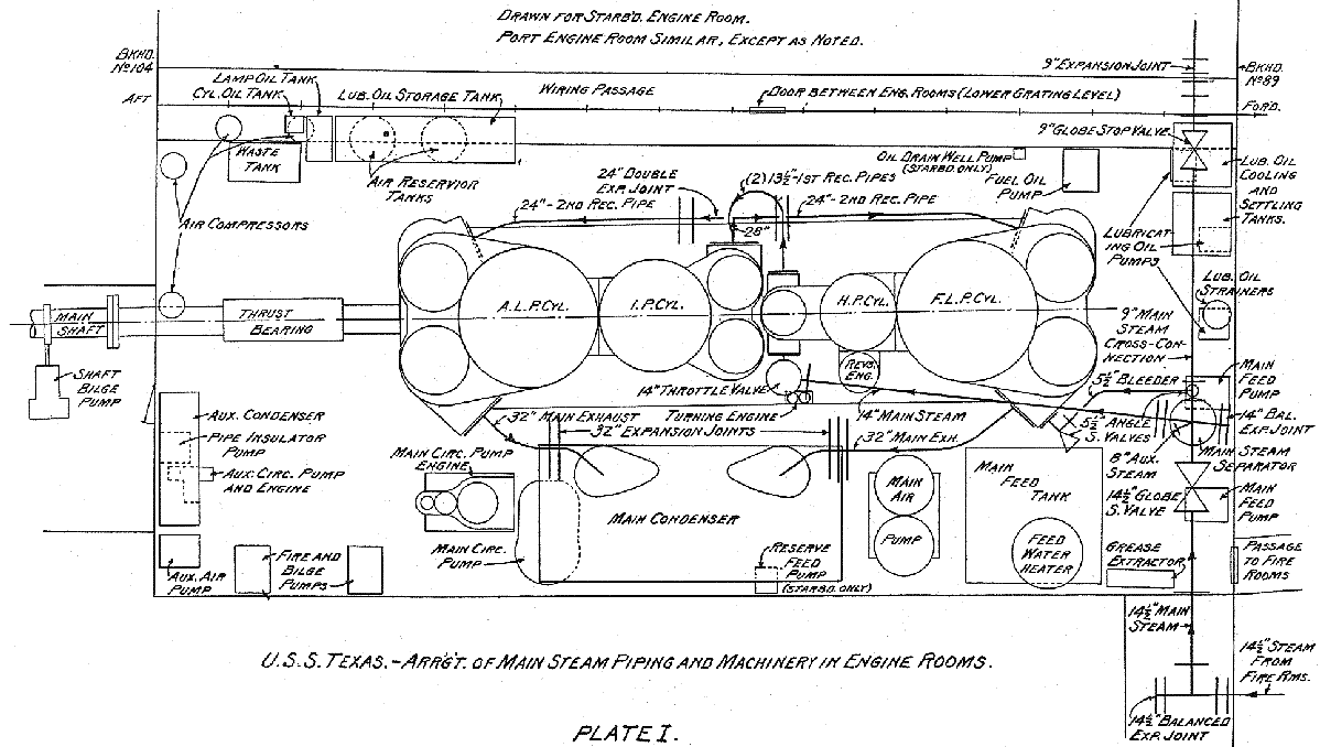 Many navies stuck with the reciprocating engine for their first batch or two of dreadnoughts, unwilling to risk failure on such expensive and important ships. The USN was unique, however, in returning to triple-expansion engines after fitting turbines. This was because the main threat the United States planned against, a Japanese invasion of the Philippines, required great endurance to cross the Pacific. While planning the New York class, the US decided that recent improvements in reliability due to forced lubrication and the increase in range at 12 kts from 5,606 nm to 7,060 nm made reciprocating engines worth it. The following Nevada class saw Nevada equipped with turbines, while her sister Oklahoma got triple-expansion engines. Whatever the logic at the time, the triple-expansion engines were not popular after WWI, and by the time of Pearl Harbor, Oklahoma was limited to 19 kts, as opposed to the 21 kts of the rest of the American battle line.