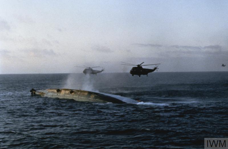 Almost immediately, it was clear the ship was doomed. Her compartmentalization and firefighting were not to military standards, and within 10 minutes of the missile hit, she was without power or water pressure, leaving only portable pumps to fight the fire. By 1615, the fire was approaching the cluster bombs, and the decision was made to abandon ship. Most of the men were aft, and they climbed down a ladder into the liferafts. Getting from the ladder into the rafts was hazardous, and several men, including Atlantic Conveyor's master, Ian North, were lost in the process. Thirteen men trapped on the flight deck were rescued by one of the Sea Kings from Invincible. The frigate Alacrity rescued most of the survivors in the rafts, but a few were plucked from the water by a Sea King flown by Prince Andrew.4 In total 12 men were lost out of 162 onboard at the time. Atlantic Conveyor herself would remain afloat for another three days before sinking while under tow.