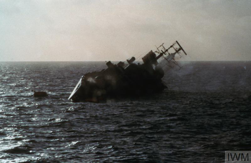 The explosion opened the destroyer's side, and she began to heel almost immediately. Smoke filled the ship, and it was obvious that she was doomed. The order was given to evacuate, and despite the smoke and heel, only 19 men of the 189 aboard went down with Coventry. Within 15 minutes, she was on her beam ends, and she soon sank to the bottom of the South Atlantic.3