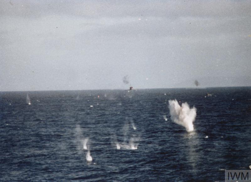 As the first pair of Skyhawks escaped, the second appeared to the southwest of the British ships, with the CAP in pursuit again. As before, Dyke ordered them off, but the Sea Dart again failed to acquire. Coventry attempted to disrupt the attackers by firing a missile blind, but it passed 300 yards clear of the incoming jets. The destroyer turned to give Broadsword a clear shot, and the frigate's point-defense missiles had a good lock as the Skyhawks bored in. Unfortunately, Broadsword failed to match Coventry’s maneuver, and just before the Sea Wolves were going to blot the attackers out of the sky, Coventry got between her and her targets. The engagement had to be aborted, and unlike the previous pair, the pilots of the Skyhawks, Mariano Velasco and Alférez Barrionuevo, delivered a textbook attack, hitting the luckless destroyer with three of their four bombs. The low-level attack should have kept the fuzes safely inert, as it had for so many bombs, but in this case, they functioned perfectly, detonating in Coventry’s machinery spaces at 1419.