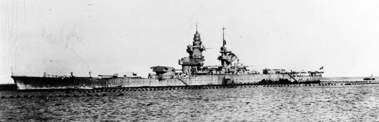 In the early months of the war, the Marine Nationale cooperated closely with the RN, dispatching its battleships to hunt German raiders and protect transatlantic convoys. In mid-1940, as the risk of Italy entering the war grew, the Dunkerques and Bretagnes were dispatched to the Mediterranean as a deterrent, operating out of Mers-el-Kebir, in modern Algeria. Unfortunately, they could do nothing in the face of the disaster that overtook France in June 1940, also drawing Italy into the war. Courbet and Paris, stationed at Cherbourg and Le Havre respectively, provided artillery support to the defenders of those cities when the Germans approached, but ultimately were forced to evacuate to Britain in late June. Richelieu, officially completed the day after Paris fell, was sent to Dakar, in West Africa, to keep her under French control and give the French government leverage over the Germans. Richelieu's sister Jean Bart, launched in early May, was hastily made ready for sea and escaped only hours ahead of the Germans, then headed straight for Casablanca with only a handful of AA guns operative. Ultimately, the Armistice signed between Germany and France on June 22nd left the French in control of their fleet,5 but stipulated that they must be returned to their home ports, many of which were in the German-occupied zone.6