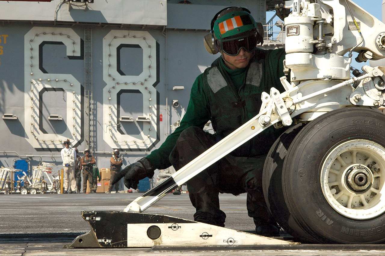 Supersonic flight is only one of three main capabilities that separate the Hornet from most of Boeing's other airplanes. The other two are the need for maneuverability in air combat, and the requirement that it operate from aircraft carriers. The Hornet is quite maneuverable, and the leading edge extensions forward help protect the engines from airflow disruptions and keep control at high angles of attack.1 The entire aircraft is aerodynamically unstable to enhance maneuverability, and uses computers to keep it flying safely, and the airframe is rated to withstand 7.5G while maneuvering. Carrier operations mean that the tricycle landing gear is built much more heavily than is typical for land-based fighters, able to withstand the "controlled crash" that is a carrier landing. Aft is the retractable arresting hook, which snags the wires on the carrier, while the nose gear has a bar installed to engage with the catapult for launch. Lastly, to save space on the carrier deck, the outer portions of the wings fold up.