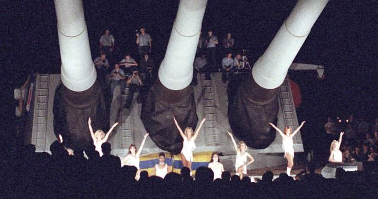 In late December, the Bob Hope USO tour visited the ships stationed in the Persian Gulf, including Iowa. Bob Hope performed, and the Dallas Cowboys Cheerleaders spent the night aboard. They were berthed in the sickbay, because it had private bathroom facilities and only one entrance, where a Marine guard was posted. Apparently, a quirk of the ventilation system spread their perfume and other scents throughout the ship, and many sailors could be found huddled near the air vents.11
