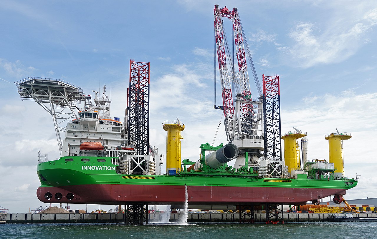 In recent years, offshore vessels have begun to diversify away from petroleum, with the development of ships designed to install offshore wind turbines. These are extremely unusual, ship-type self-propelled vessels that jack up to plant the bases of the turbines. The reason for this configuration is to allow the vessel, which can carry up to 5 turbine bases, to quickly transit between installation sites without the need for a tug.