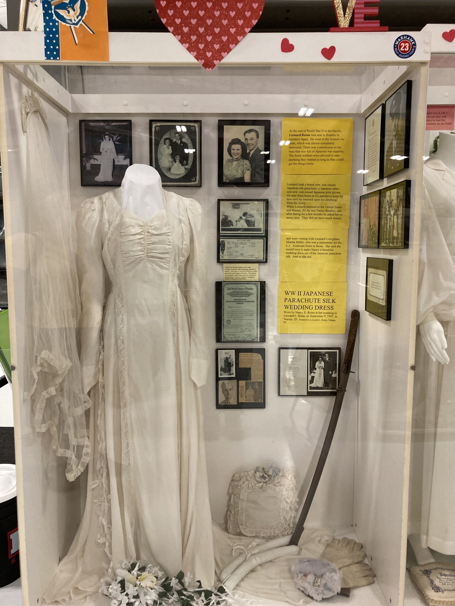 As you wander around you will encounter this brass lampstand (not sure what else to call it) made entirely from spent military cartridges. In a nearby cabinet, you will find a wedding dress made from a Japanese parachute. Brought home as a souvenir by a service man, and when his fiancé accepted his proposal, they realized they had no money for a “proper” wedding dress. So, the parachute was repurposed by a neighbor into a very beautiful wedding dress.