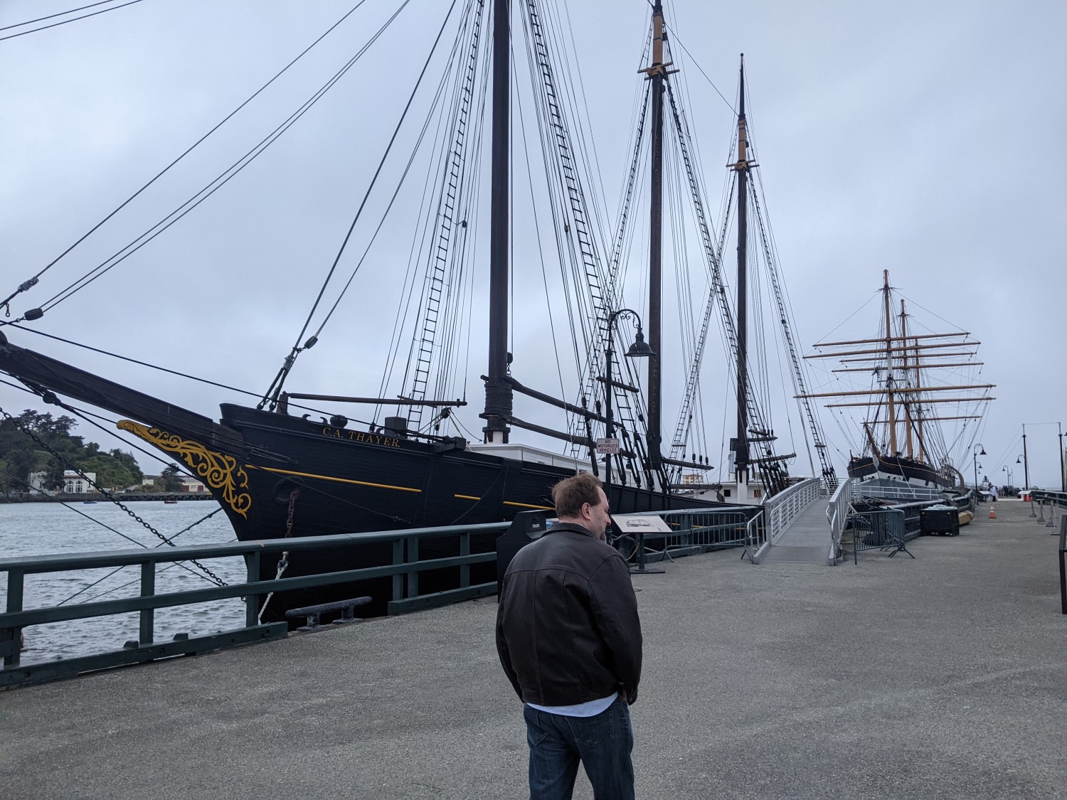Ahead of Balclutha was C.A. Thayer, a wooden schooner built to carry lumber from the Pacific Northwest to San Francisco that later became a fishing mothership off Alaska, serving in that role until 1950. She was in worse physical shape than Balclutha, and badly needed at least a coat of paint. Again, nothing apart from the main deck was open and the signage was bad, although Cassander and I did go down into the hold, which at least gave an interesting perspective on wooden ship construction.