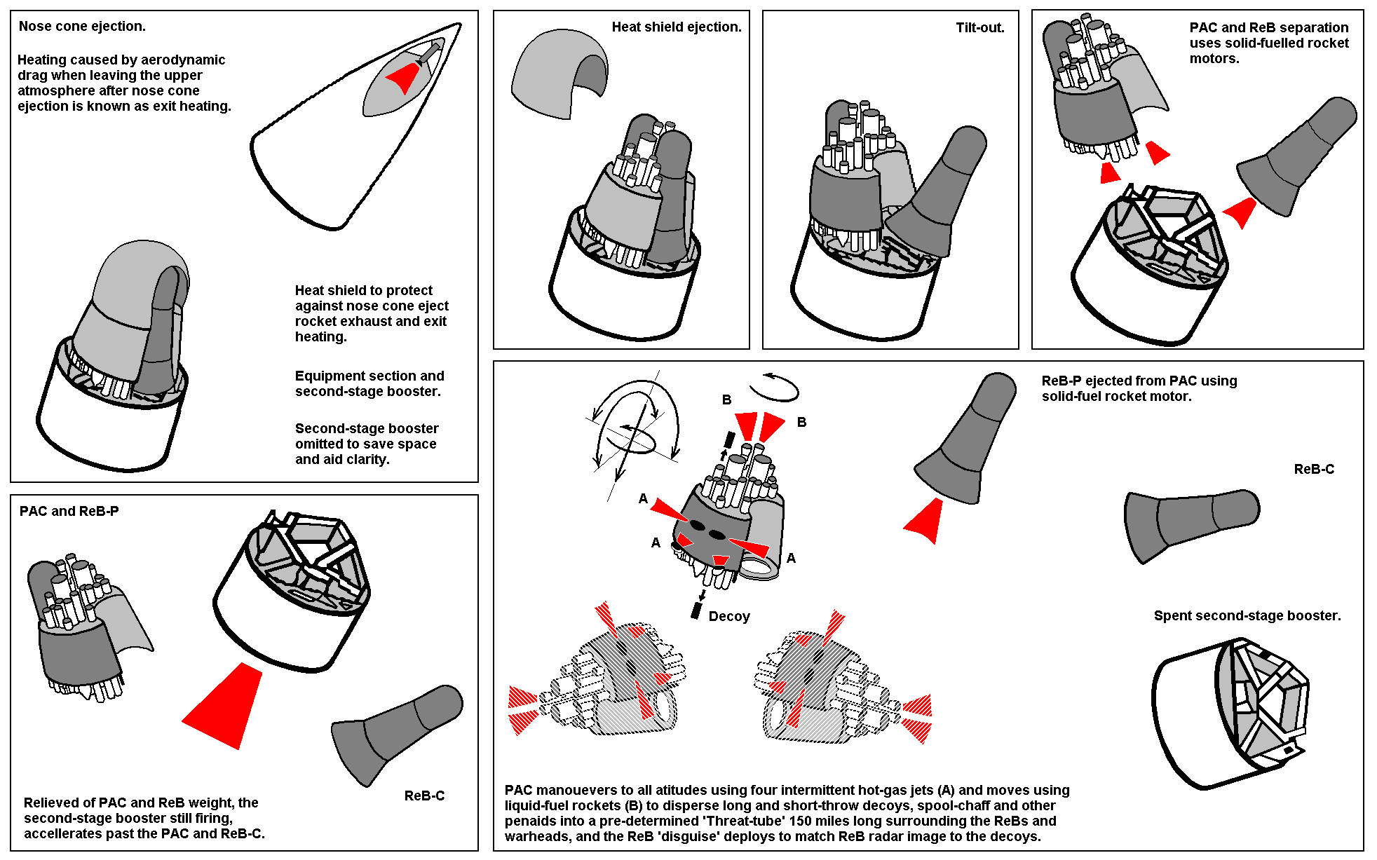 Development of Chevaline began in 1970, and continued for the next decade in extreme secrecy.7 The basic plan was fairly simple. One of the two warheads would be mounted about the Penetration Aid Carrier (PAC) along with a bevy of decoys, while the other would be ejected directly from the missile as in a normal Polaris A3. The PAC would move around, ejecting decoys as it went, before finally separating the second warhead. A total of 27 decoys were carried, which in theory should have raised the number of total targets enough that the Soviets couldn't shoot down all of the British warheads before some reached Moscow. The Soviets were prevented from solving the problem through brute force by the 1972 ABM treaty, which limited them to only 100 interceptors around Moscow and required them to leave other cities uncovered.