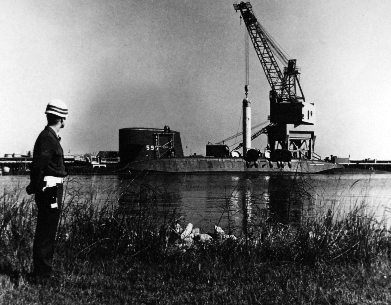 Once this decision was made, work began on a design, known as SCB 180, which would be broadly comparable to the contemporary Permit class SSNs. However, when the program was accelerated in late 1957, it became obvious that the first boat of this design couldn't possibly enter service before 1961, so alternate measures had to be taken. The first batch of SSBNs would instead be based on the earlier Skipjack class SSNs, the first of which had already been laid down. The plans were essentially sliced in half, and a missile compartment based on the one designed for SCB 180 was placed in the middle.1 The new submarine had the highest priority, and it appears that the submarine Scorpion, laid down in November, was actually cut in half and another submarine of that name laid down to take its place the following August.2 Four more boats of the same type were ordered as new-builds, although material from at least one other Skipjack was diverted to support the building program. George Washington was launched in June 1959 and commissioned on December 30th of that year, just shy of two years after she was ordered.