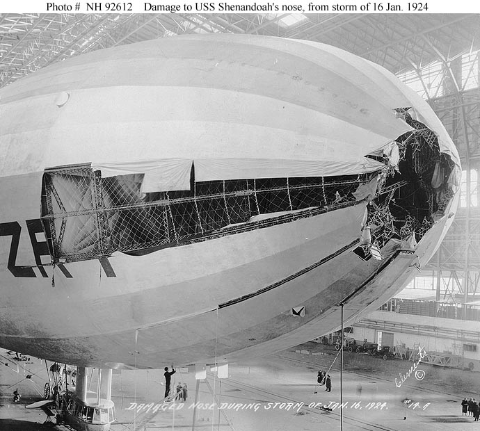 While she had been out of action, Lansdowne had made a number of modifications to lighten the ship and reduce the loss of helium. Many of the automatic valves were removed, putting the cells at risk of rupture if she rose too quickly. A planned publicity trip to the Midwest was delayed from June to September due to the risks of hot weather and summer storms, and Shenandoah spent July and August operating with the fleet, including the first tests of strategic scouting, refueling at sea, and even using her as a tug for anti-aircraft targets. But on September 2nd, Shenandoah cast off on her 57th flight, bound for St. Louis, Minneapolis and Detroit. While over Ohio, she ran into a thunderstorm, which tried to hurl her high into the air, despite the use of full power by her engines. Substantial amounts of helium had to be valved off before the airship ran into a downdraft. Even dumping several tons of water wasn't enough to arrest her descent, and at 3000', she was again hurled upward by an ascending air current. The stress on her structure proved too much, and she snapped in half, throwing several of the riggers who had been working in her keel into the sky. The control car broke away, killing Lansdowne, and aft section fell nearby. The men in the buoyant forward section were able to bring it gently to earth an hour later by carefully valving off helium.