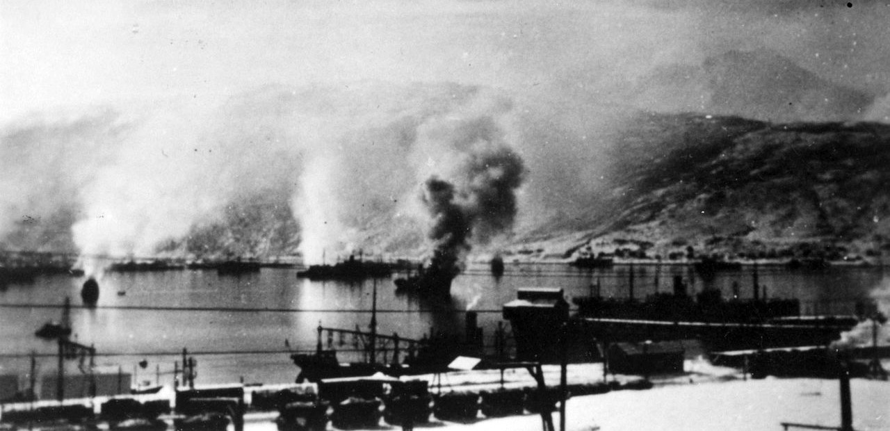 Ships burn in Narvik harbor after the British attack