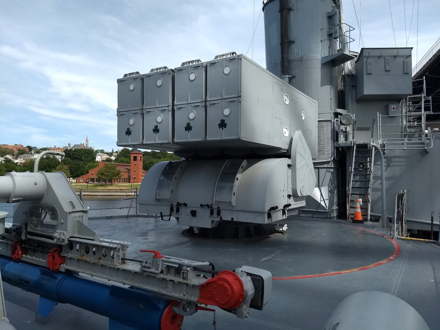 ASROC launcher aboard destroyer Joseph P Kennedy at Battleship Cove. Note the reload equipment and dummy rocket at lower left.