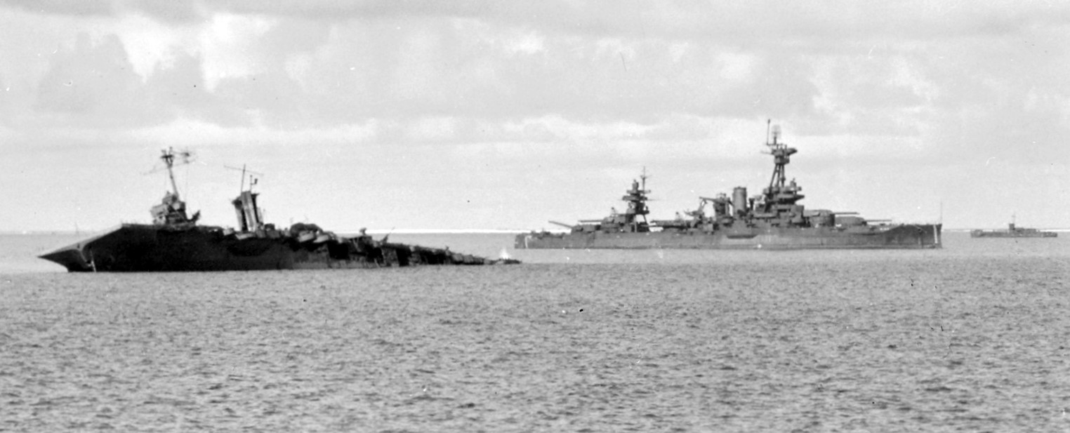 Three submarines, Pilotfish, Apogon and Skipjack, were submerged within a thousand yards of the bomb, and were sunk almost immediately, their thick hulls no match for the bomb's force. Saratoga was about 350 yards away from the zero point. The first wave, which crested at a height of 94', hit her broadside, and drove her back another 450 yards, while the crest of the second wave collapsed over her, crushing her superstructure. Beloved Sara fought for life, staying afloat for almost 8 hours after the detonation. The first crew into the lagoon made a valiant effort to tow her ashore, only to be driven back by the radiation unleashed by the bomb.