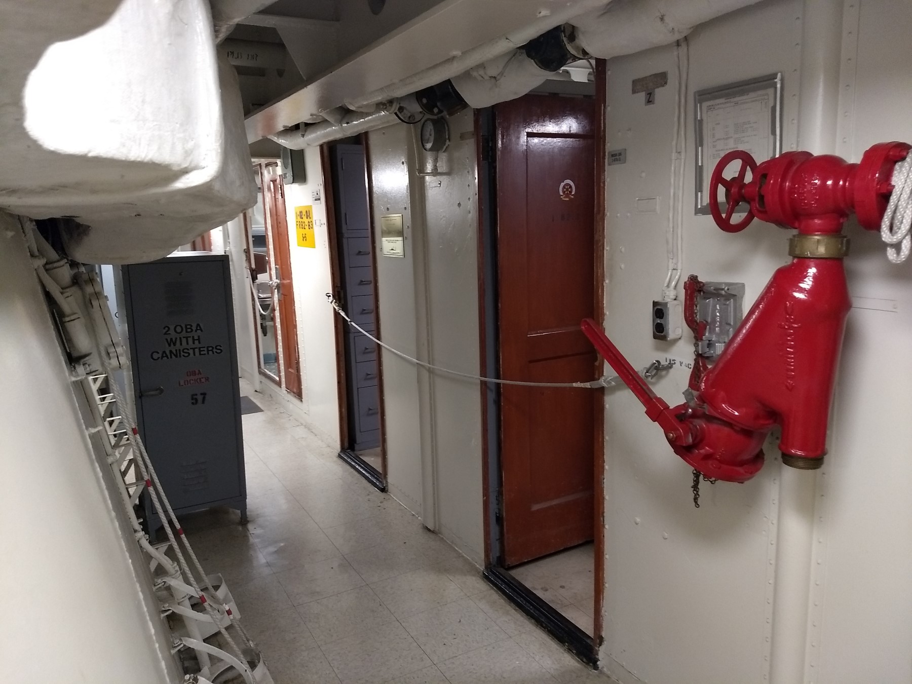 The passage just forward of the wardroom. Note the box of OBAs1 and other emergency gear scattered about.