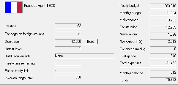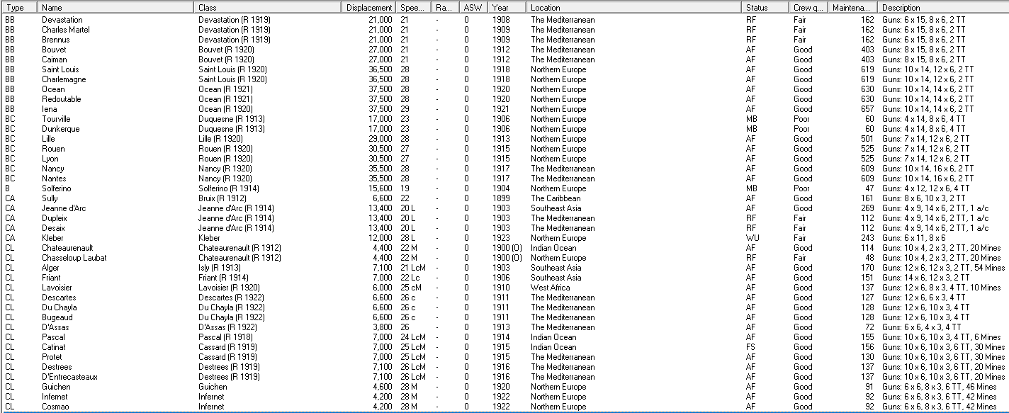 Once the Republiques are finished we should start a new battleship, but I wouldn't mind getting a couple of improved Kleber type CAs instead of a second BB. It's tricky enough keeping up with the Germans as it is, because of their greater budget, but we still need to cover the Med. I'd like to be able to mark the Austrian CAs and Italian BCs with something cheaper than a new BB or a Nancy (and faster than a Bouvet) rather than rely too much on aircraft at this stage.