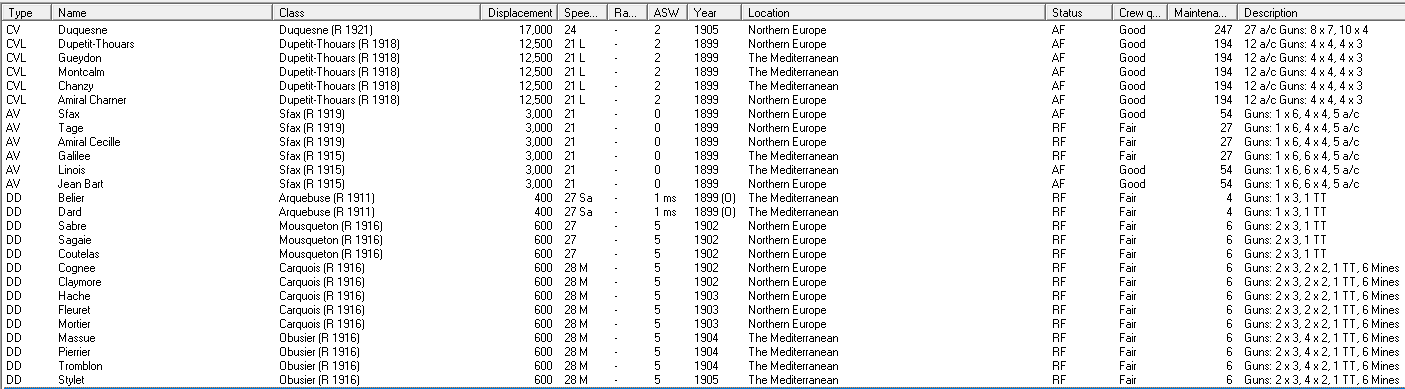 The last year has been good for us. We have commissioned our first CV, as well as the last of the CVL conversions, bought torpedo bombers from the British, and made major strides in our CL design. Lalande, laid down a month ago, has a speed of 29 kts and three triple 6" turrets.