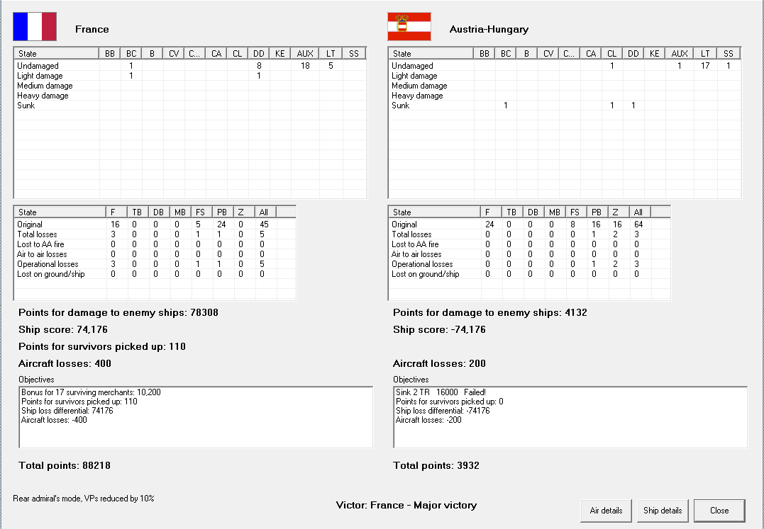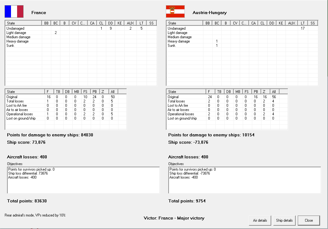 Austria declines to oppose a bombardment mission against Albania, netting us 5760 VP, then declines a cruiser action in the Ionian sea, giving us another 4800 VP. Lastly, their fleet rushes for cover in the southern Adriatic, giving us 9165 VP. We finally fight a destroyer action off Corcera, where several of our destroyers sink an Austrian AV. 734 VP for us, 0 VP for them.