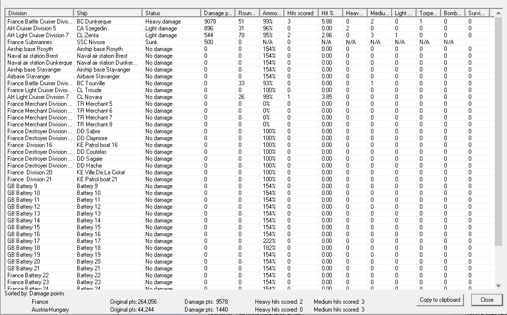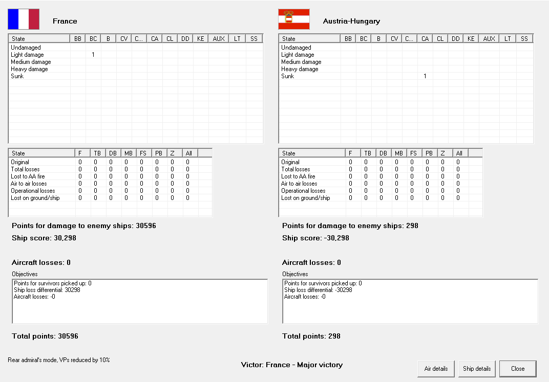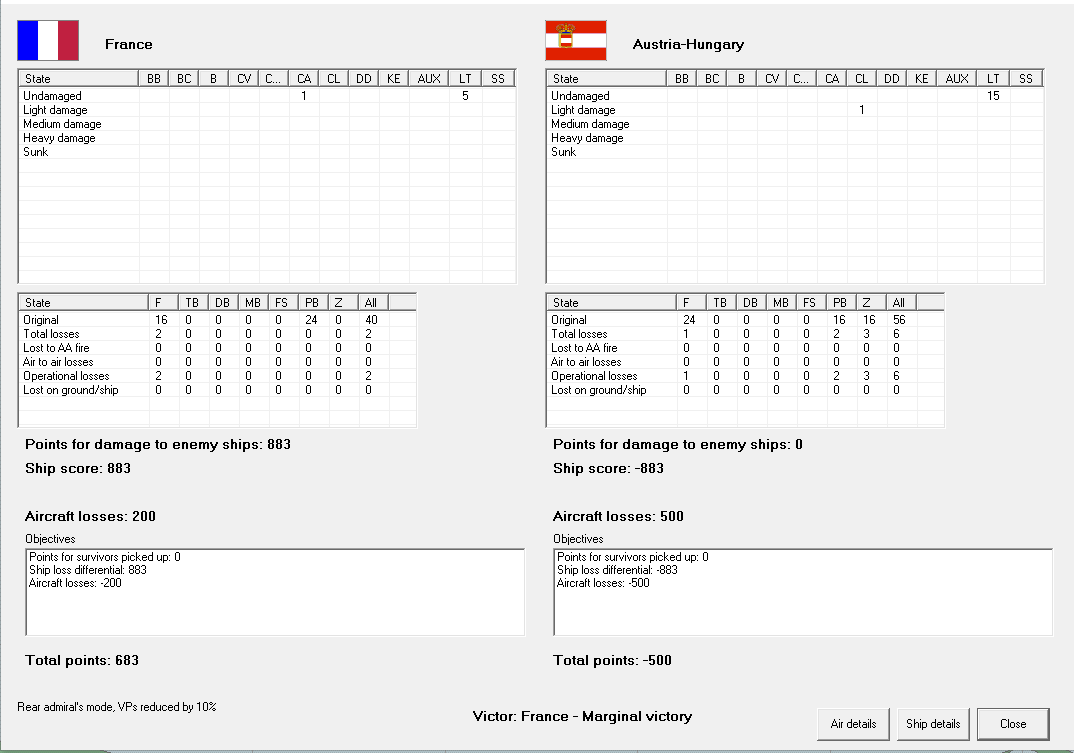 Coastal raid off Western France. CL Troude leads BCs Dunkerque and Tourville, who encounter an Austrian formation of 1 CA and 2 CL at dusk. Unfortunately, night falls before more than a few hits are landed on the Austrians. A chance encounter late at night sees the Austrian ship escape. BC Dunkerque was torpedoed on her way home, and one of our submarines failed to return, giving the Austrians the victory. 746 VP for them, 316 for us.
