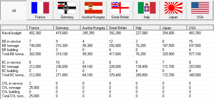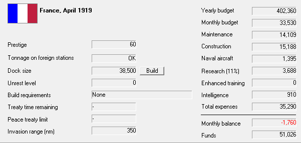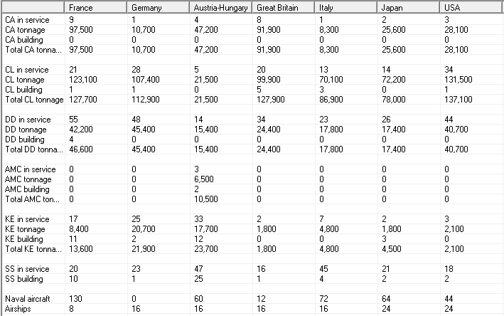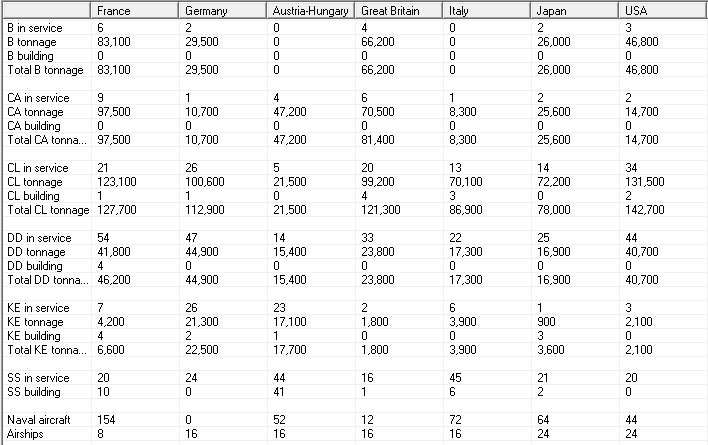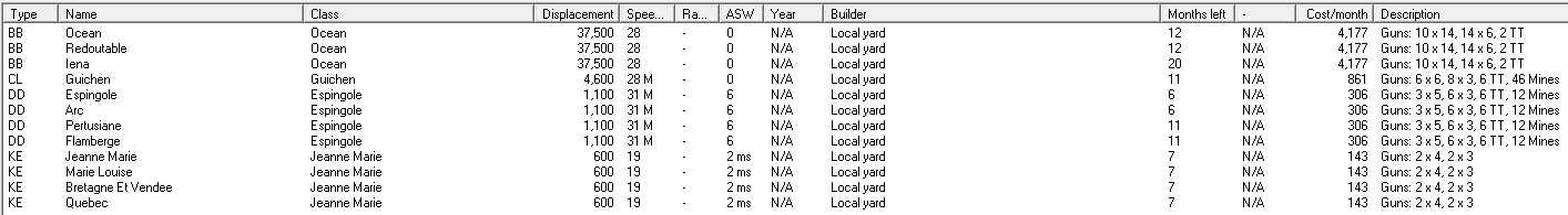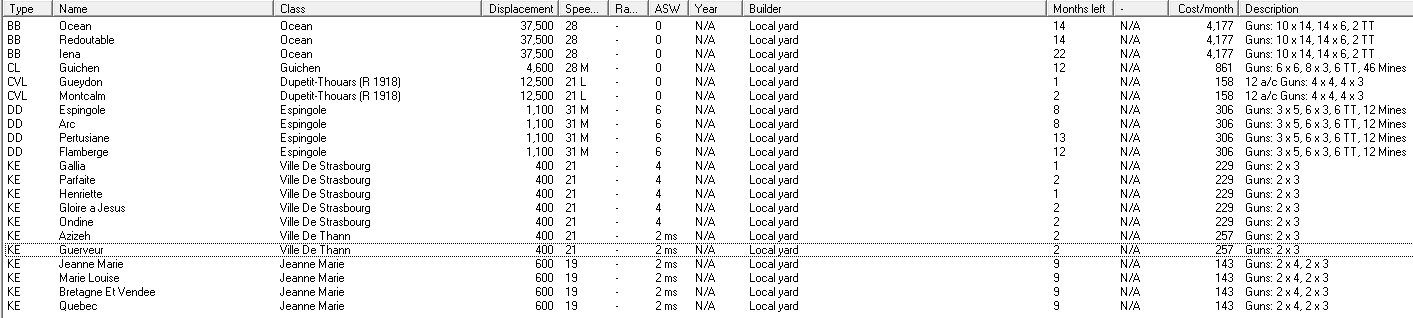 Okay, that sounds good. We've got quite a lot of upgrading and conversions to do, between the Sfaxes, D-Ts, eventually the Duquesnes, as well as cruisers and those destroyers, but that's cheap compared to building new ships, and with tensions low we can spare them while they are in the yard. If we do have the budget for new ships (which might not be until the Oceans are finished) I'd stick to smaller ships, CLs, DDs and KEs until we can retire at least everything that was in service around the turn of the century.