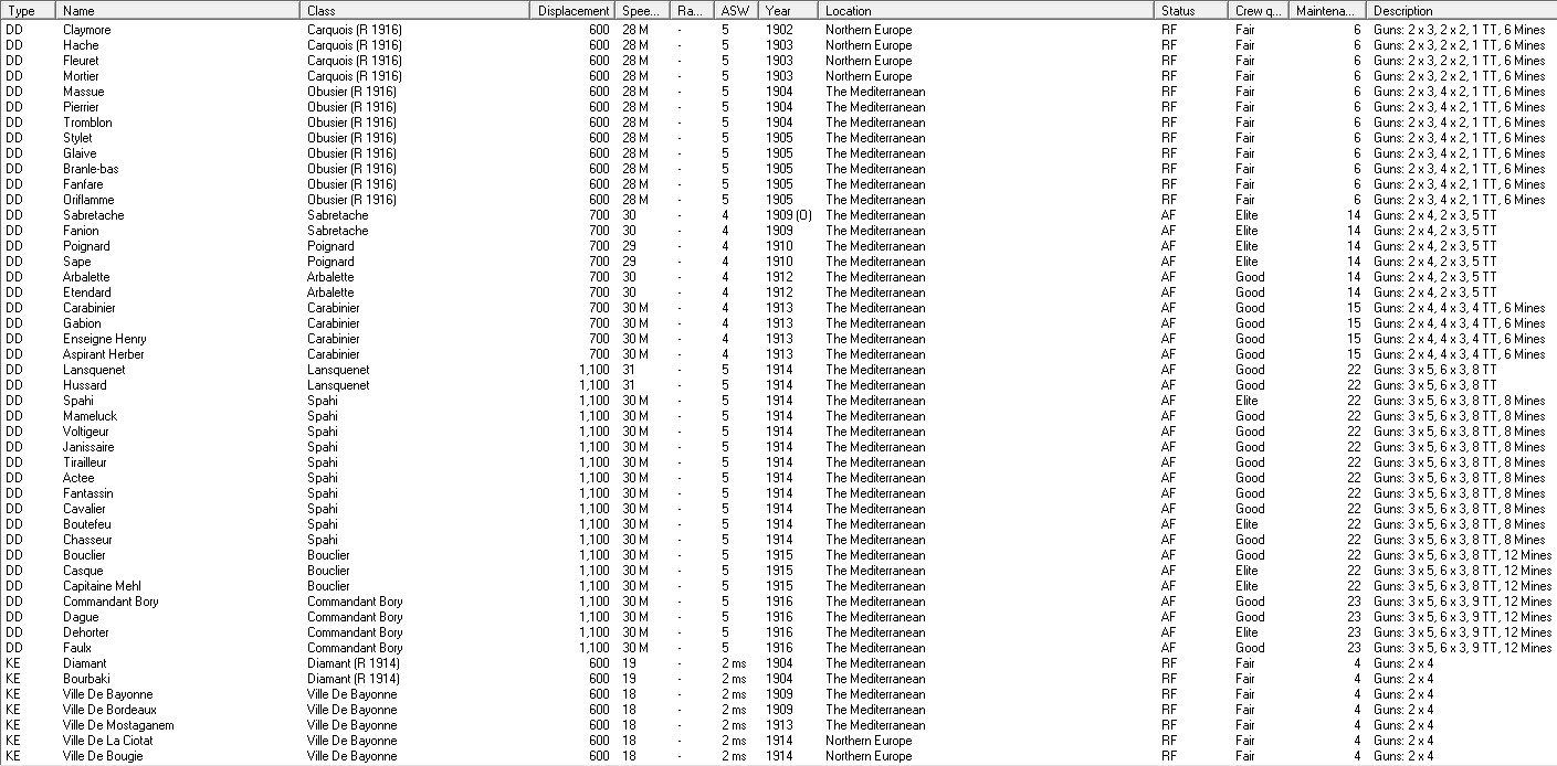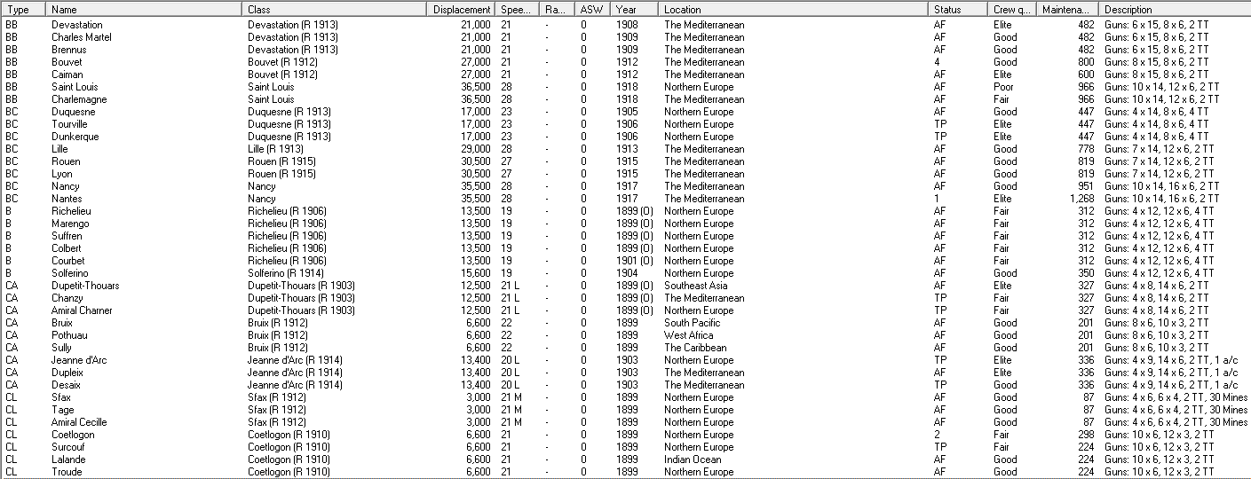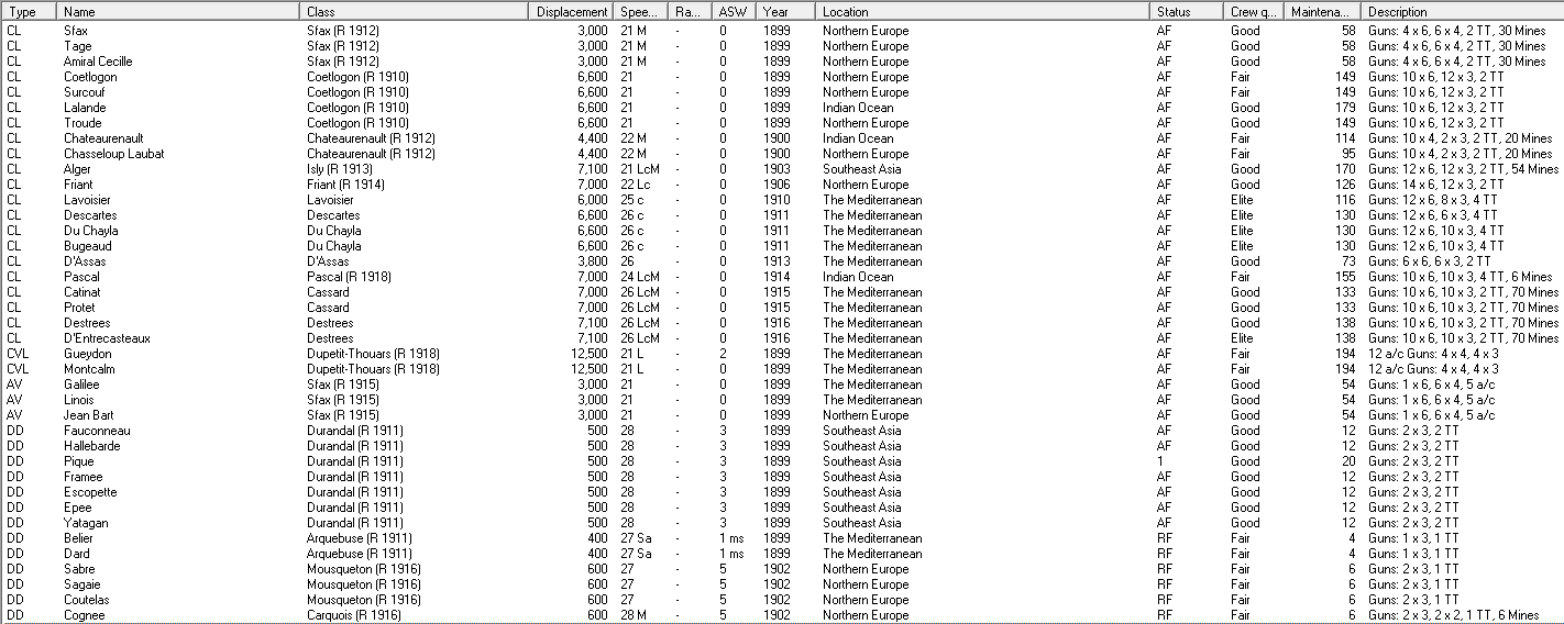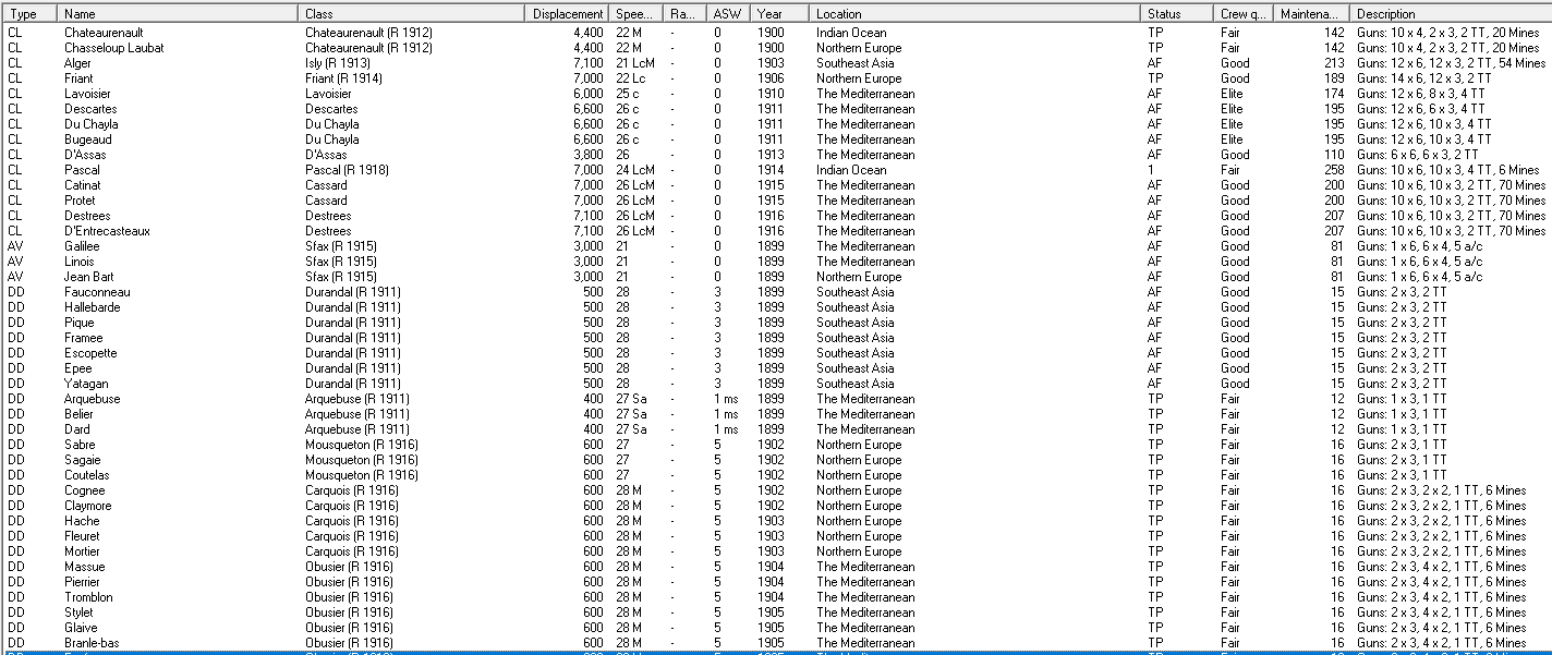 Most of the other countries still have a few 'resistables', but yeah, we should scrap some and mothball any we want to keep. We might also send the Duquesnes or even the Devastations to the reserve. There are probably other ships that want scrapping too - the remaining Arquebuses and Durandals for instance. Is it worth converting the rest of the Sfaxes as well as the D-Ts?