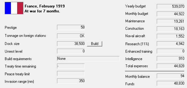 CVL Gueydon finishes reconstruction. 2 KE commission. Parliament authorizes a new war loan, increasing the naval budget. Breakthrough: Superimposed guns on DD. An enemy sub sinks a KE. DD Arquebuse hits a mine and sinks. We sink Austrian B Erzherzog Friedrich with a mine in the Med. We lose 5 merchies to subs and 4 to raiders, but sink 3 subs. British operations add 210 VP. Germany commissions 1 KE, AH 5 KE, UK 1 CL, Japan 1 AV. 260 VP for blockade. Design work begins on new CL Cosmao (modified Guichen) and DD Rapiere (Espingole with superimposed forward gun).