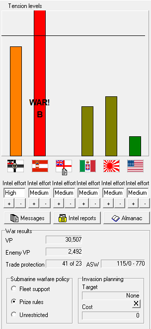 Our spies steal plans for Japanese AV Hoten Maru and Italian BC Elba. BB Bouvet is torpedoed and will be in dockyard hands for 4 months. B Magenta is sunk by a mine in Northern Europe. We get a single merchie, and lose a sub. Their subs and raiders each get 9 of our ships. AH lays down an AMC. Germany commissions a KE, AH 1 AMC, 4 KE, Italy 1 CL, Japan 1 BB. 220 VP from blockade.