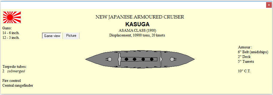 The British and Japanese CA's are... odd. One knot slower than CA-01-I, comparable armor, but there aren't any main guns listed! Our CAs have 9 inch main guns and 6-inch secondaries, they have just the 6-inchers. Which is really confusing, because the picture clearly shows two double turrets.
