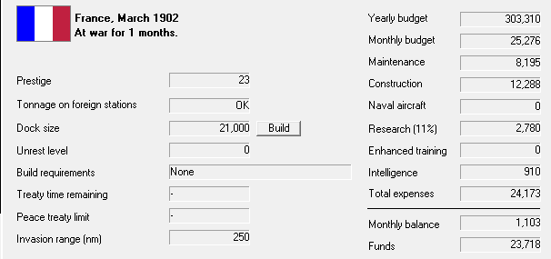 Private shipbuilding expands dock by 1000 tons. B Devastation finishes working up. Austro-Hungarian government changes, and we request a budget increase to counter the potential threat. Germany laid down a CA, US a CL. US commissions a CL. Intelligence shows that someone has stolen industrial secrets from us, but we don't know who. Tensions are now as high with A-H as with Italy. Increased budget allows DDs Sagaie and Coutelas to be laid down.