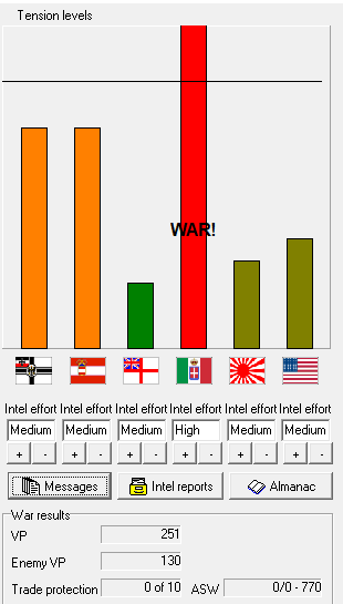 So far as we can tell, Italy has no forces outside the Med at the moment, although I expect them to deploy raiding cruisers fairly soon. We currently have 14 destroyers outside of the Med. I've set 10 for Trade Protection and ordered the other four to move in.