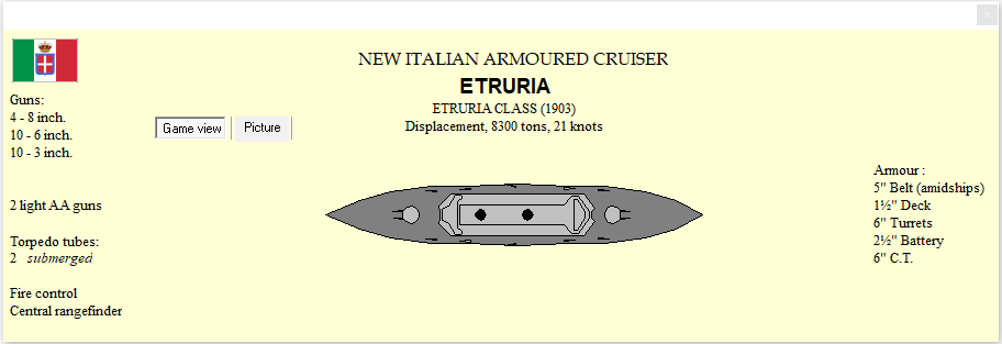 With the commissioning of B Solfierno, we have a gap in our construction program. To fill it, and give us a tactically homogeneous unit of four ships, a slightly modified Duquesne is designed. The main improvements, allowed by better machinery, are an extra .5" of belt and two more 4" guns, along with integration of Central Firing from the start.