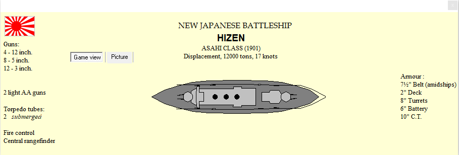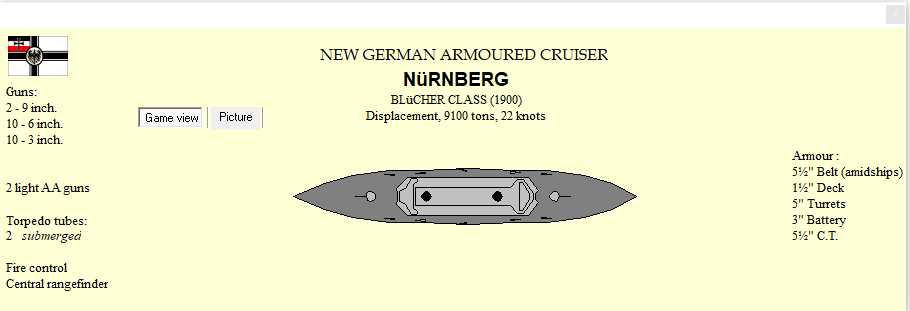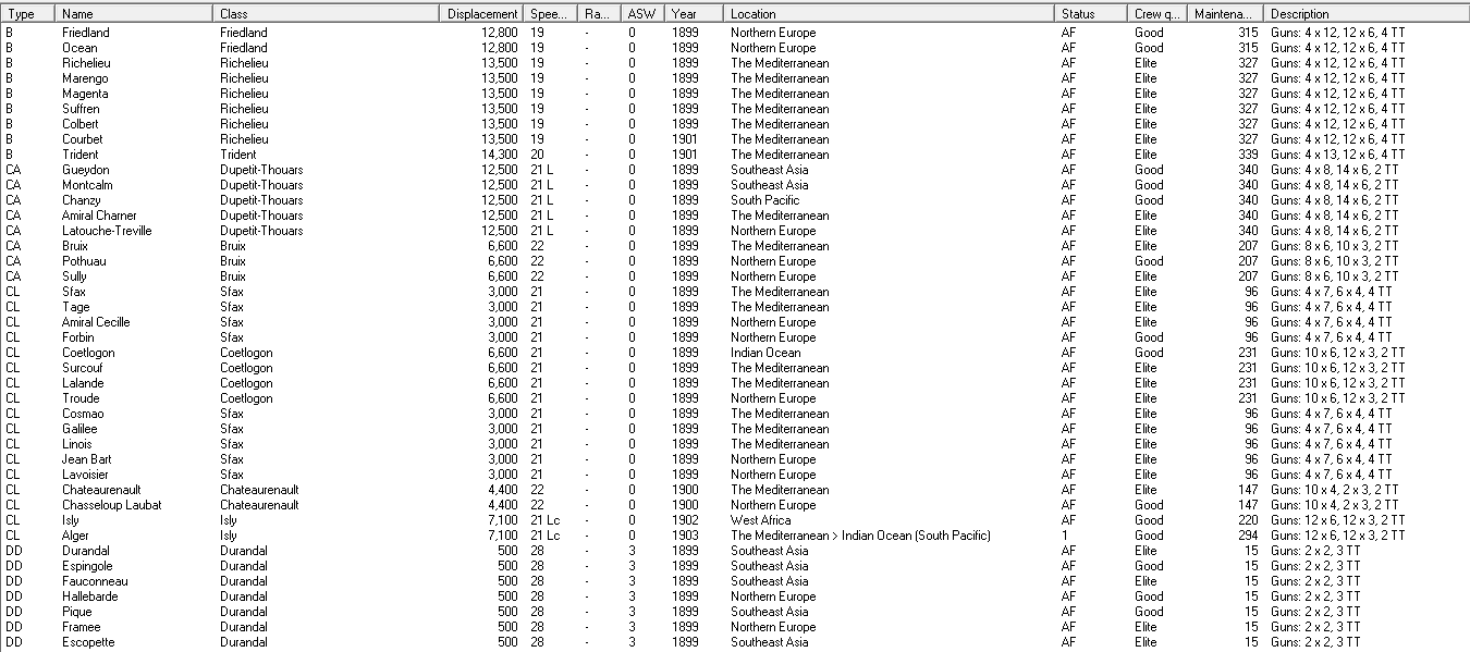 Design work began on BC Duquesne. DD Fleuret commissioned. In an interview, I suggest we are most likely to fight Austria-Hungary. Breakthrough: Active Mine Warfare. Germany has increased her naval budget, and laid down a B. A-H has increased naval spending, commissions a CA. UK commissions a CL and two KE, Italy a KE and 2 DD.