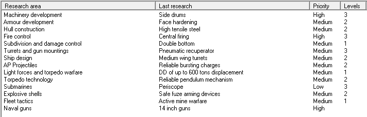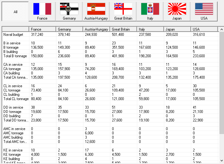 CL Alger finishes working up. Plans for Italian CA Etruria stolen. Breakthrough: Reliable pendulum mechanism. UK lays down 1 CL, 2 DD. Italy lays down 2 DD, Japan 1 KE. Germany commissions 2 CA, 1 CL. AH commissions 1 KE, US 1 CA, 2 CL, 1 DD.
