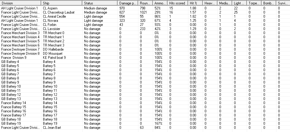 The final verdict is that most of their battleships are damaged, but none badly so. We took a heavier toll of their destroyers, but didn't sink any, either. We did deal enough damage that it's a victory for us. 397 VP for us, 256 VP for them.