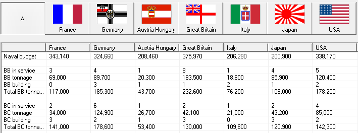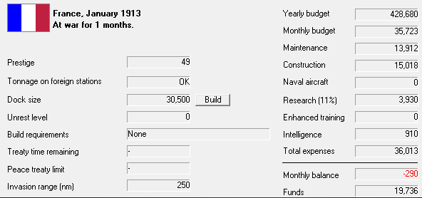Right. Got through the entire year that time, and it was a rather exciting year, too. We now have the most powerful warship afloat, as well as 10 new destroyers and 3 new light cruisers. And a dock capable of holding 35,500 tons. In 4 months most of the destroyers commission, and we can lay down a new ship or two. We got really lucky with our budget, although the US and Germany are still ahead of us somehow, and Germany is nudging the UK for first place, which really shouldn't be happening.