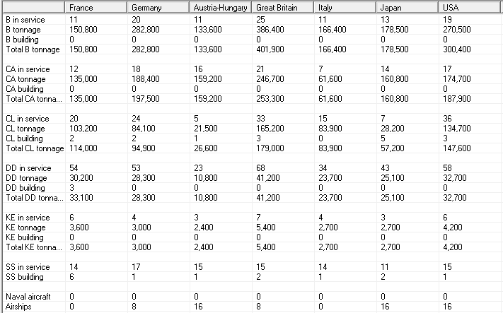 Design work begins on BC Rouen. Italy lays down BB, Japan and US CLs. Germany commissions 2 BB, BC, Japan commissions 2 DD.