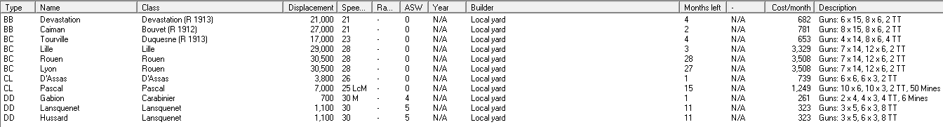 The biggest problem with that is just that capital ships take an awfully long time to build, so that means a 2.5-year gap after the Rouens complete. That's time we can't get back. A good compromise might be to do destroyers only and do a shipyard expansion. They'll both finish in about a year, which gives us a chance for more new tech in the new ship(s).