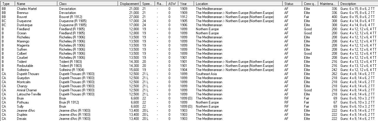 I checked everybody's designs. The British are the only other power to embrace guns bigger than 12" in a big way. The Italians, too, but those are only 13". The US has a few. Germany is still 12" only. Most people are still using wing turrets, and the BCs mostly have belts thinner than the Duquesnes. But this is about the point that usually stops.